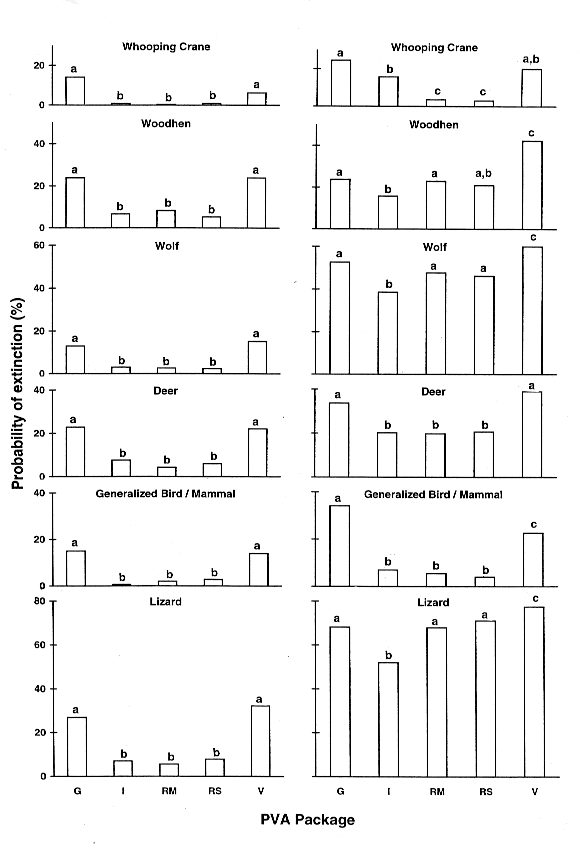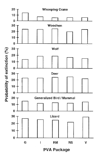 Simulation conditions Each of the PVA packages (except GAPPS) provides a computation of the deterministic growth rate, based on the input population model. In each case, this was checked to ensure that the underlying deterministic components of the models were identical across all packages. It was found that the deterministic projections of the models (i.e., excluding demographic and environmental stochasticity) were identical in INMAT and the RAMAS programs. It was not possible to run a deterministic projection in GAPPS or VORTEX. For each example, two sets of stochastic simulations were run with each of the five PVA packages, with either (1) demographic stochasticity only, or (2) both environmental and demographic stochasticity included in the models. It was not possible to run the simulations with only environmental stochasticity applied (i.e., excluding demographic variation) in GAPPS, INMAT, and VORTEX, so this scenario could not be evaluated across packages. Two separate comparative simulations were run on each taxon. The first was concerned only with measuring the risk of extinction or quasi-extinction. Prior to running the final simulations, test runs were conducted for 50 years, and the initial population size was adjusted to ensure that all packages showed a greater than zero extinction risk under demographic stochasticity only. Equivalent simulations that also included environmental stochasticity resulted in nonzero extinction risks. The second set of simulations was used to measure the population size and population growth output measures. Test runs were trialed to guarantee that no extinctions would occur. This was done by adjusting the initial population size. Where necessary, the simulation duration was reduced (to avoid reaching very high population sizes, which causes GAPPS to crash). For each species, the simulation duration and initial population size and distribution were identical across all PVA packages. Absolute extinction risk is not independent of population growth measures such as mean and median population size. Because extinction (zero population size) acts as an absorbing boundary for the simulation replicates, when the extinction probability increases, the mean population size will decrease. All simulations were replicated 500 times (for justification, see Harris et al. 1987). This was the preset number of iterations in INMAT. For statistical purposes, this provides a sufficiently high degree of replication, as the 95% confidence intervals for extinction risk are only ±4%. (based on the Kolmogorov-Smirnov test statistic; see Sokal and Rohlf 1995). Data analysesDifferences between means were compared with ANOVAs and pairwise comparisons with t tests (with a Bonferroni correction on the probability threshold for the number of comparisons). Differences among medians were evaluated using Kruskall-Wallis tests (overall) and Mann-Whitney tests (pairwise), and variances were evaluated with F tests. Extinction probabilities were evaluated using contingency chi-square tests (across all packages). Bonferroni-corrected Kolmogorov-Smirnov tests (based on the confidence interval for percentages of the binomial distribution) were used for pairwise comparisons of extinction probabilities. Sokal and Rohlf (1995) provide a detailed description of all these tests. The Bonferroni-corrected significance level for all these tests was set at 5%. To detect overall trends across taxa, the PVA packages were assigned a rank (from 1 to 5) for each species, with 1 assigned to the package that produced the lowest estimate of extinction risk (or lowest mean final population size), and 5 assigned to the package that provided the highest risk. If all of the PVA packages were to give similar predictions, on average, the ranks would be equal. The nonparametric Kruskall-Wallis and Mann-Whitney rank tests were used to evaluate this. Power analyses showed that, with a sample size of 6, a difference in rank of >1.7 would be required to show a significant difference between packages.