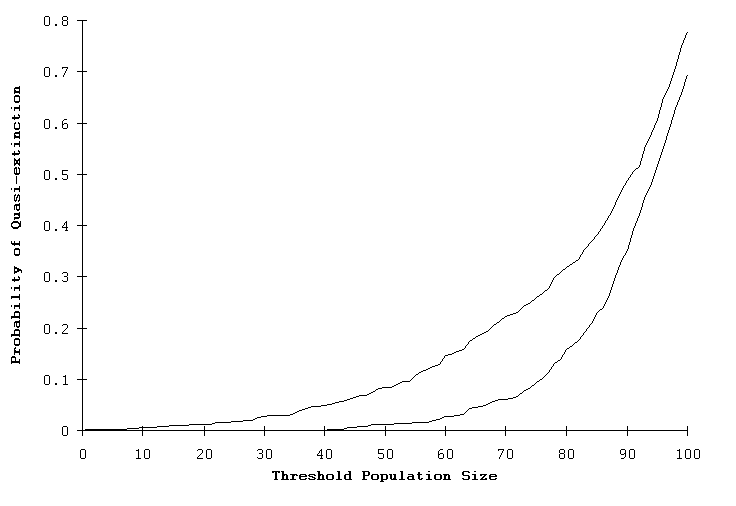 Important and consistent differences were evident between the predictions of extinction probability for the individual-based packages (GAPPS and VORTEX: higher risk) vs. the matrix-based packages (INMAT, RAMAS Metapop, and RAMAS Stage: lower risk) in standardized comparisons. The explanation lies in the implementation of demographic uncertainty in the sex ratio. In modeling both males and females, the individual-based packages consider the possibility of a temporarily unequal sex ratio. By contrast, the matrix-based programs either ignore differences between the sexes, or, alternatively, model only females. When monogamous breeding is modeled, a temporary shortage of males can greatly decrease the breeding rate and increase the extinction risk (see McCarthy et al. 1994, Brook et al. 1999). However, the standardized models examined in this study were set up under a polygamous breeding structure; thus, this potentially important element of stochasticity was ignored. In contrast, a sex ratio imbalance is possible in the individual-based packages, as the total number of females available for breeding may temporarily constitute either less or more than 50% of the total population, because of demographic stochasticity in survival or sex ratio at birth. For example, in the matrix models, an adult population size of 20 always equals 20 breeders (an individual’s sex is ignored). Yet, in the individual-based models, an adult population of 20 may temporarily consist of 15 males and 5 females (substantially decreasing the population’s realized reproductive output), or, equally, it may consist of 5 males and 15 females (increasing the reproductive output). Although these fluctuations will cancel out, on average (reflected in the relative congruence of the projected mean sizes), the variability of the population growth rate in the latter case will be greater, especially at small population sizes. It seems highly likely that the greater fluctuations induced by this sex ratio factor are the major reason GAPPS and VORTEX predict higher risks than did INMAT and the RAMAS programs. Confirmation through simulationThis explanation was tested with RAMAS Stage, which is flexible enough to model either one or both sexes. Using the HP life history and including only demographic stochasticity, RAMAS Stage was set up to model males and females separately (as in GAPPS and VORTEX). As an initial test run, both “males” and “females” were allowed to produce offspring (directly equivalent to the standard matrix model). The predicted extinction risk from this model, 1.6%, was not significantly different from that predicted by the conventional single-sex matrix model of 2.4% (based on the Kolmogorov-Smirnov confidence interval test). The RAMAS Stage model was then altered so that only females produced offspring (with their fecundity doubled), making it essentially equivalent to the two-sex, individual-based models of GAPPS and VORTEX. The mating system remained polygamous, because the number of breeding females was not dependent on the number of available males. When this RAMAS Stage model was run, the predicted extinction risk increased to 13.1%, not significantly different than that of GAPPS (15.1%) or VORTEX (14.3%). Further, when the two RAMAS Stage models (single- and two-sex models) were run with an initial size of 100, there remained large differences in their predicted risk of quasi-extinction, as illustrated in Fig. 2. The standardized model of the Whooping Crane described by Brook et al. (1999) did not show any clear difference between the individual- and matrix-based PVA packages because the predicted extinction probabilities under demographic stochasticity were close to zero.