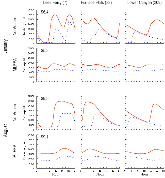 Many socioeconomic indicators are affected by the operation of Glen Canyon Dam. In this analysis, we consider the direct economic costs of alternate flow regimes on power revenue generation. We also model the effects of flow changes on whitewater rafting in Grand Canyon and flow/temperature effects on trout angling in the Glen Canyon Reach immediately below the dam. Our rafting index is a comparison of campsite demand and availability, whereas our angling indices track changes in total catch, catch rates, and effort. Regional economic impacts and economic values of rafting and angling in each month of the simulation are computed based on previously published models (Bishop et al. 1987, 1989, Boyle et al. 1993). Regional economic impacts are based on estimates of the impact of commercial and private trips for individual rafters or anglers (adjusted to 1997 dollars) expanded by the number of trips simulated in the model. Regional economic impact per trip is assumed to be static over time, whereas the economic value varies according the mean monthly discharge and the extent of daily flow fluctuations.