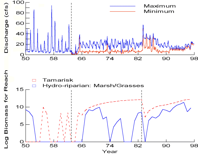 Simulated abundance of hydroriparian (marsh and grass) and Tamarisk (salt cedar)-dominated communities in upper Granite reach. The natural system reference point prior to impoundment (1963) has little vegetation below seasonal high flow stage. The1982 point shows considerable development of shoreline marsh and salt-cedar communities from 1963 until just prior to the1983-1984 floods, and the 1990 point shows virtually complete recovery of these communities within 15 years after those floods.