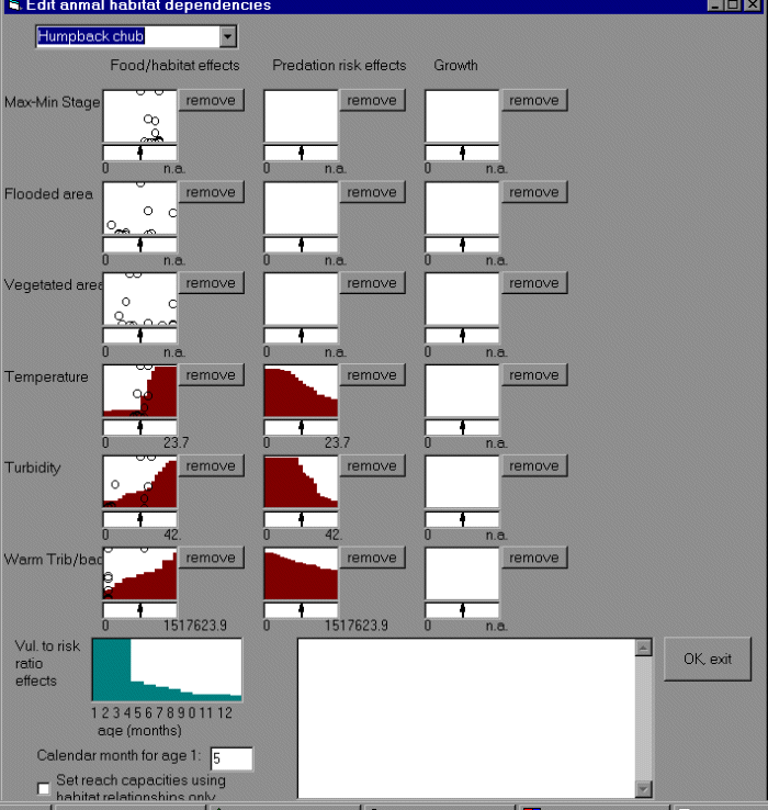 Each "habitat linkage function" Hr(m) and Hf(m) is calculated as a product of effects over habitat factor values for month m. (Habitat factor values available in the simulation for each reach, and month include temperature, turbidity, max-min stage, wetted area, and warm tributary + backwater area). Using the interface shown in Appendix 8, model users can sketch functions of the form h(Vk), where 0< h <1, and Vk is the value of the kth habitat factor in month m (e.g., V1 is the max-min stage, V5 is turbidity); V scales are set relative to 1993 baseline values. Each H is then just the product h(V1)h(V2)