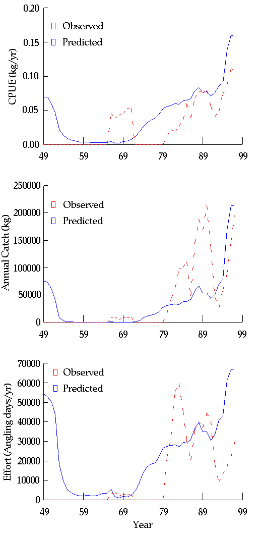 Comparison of simulated and observed trends in rainbow trout relative abundance (sport fishing catch per effort), catch, and fishing effort. Simulated abundance declines at the start of simulation due to “removing” GCD, then replaying the history of physical changes from 1949 to1997. Note that no data were collected prior to 1966 or between 1972 and 1979.
