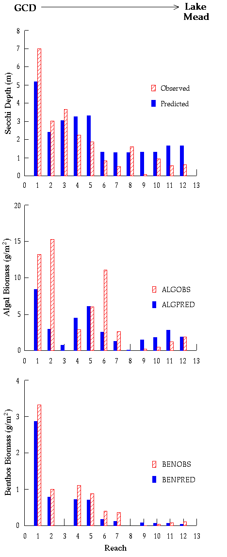 Comparison of mean simulated light attenuation, and algal and benthos biomass by reach, using mean observed values (1993-1996).
