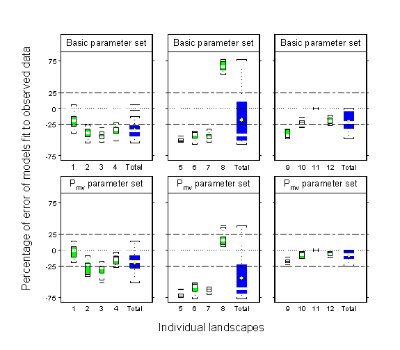 The addition of a stream boundary behavior to the PERMEABILITY model was, in most cases, a clear improvement over the VISCOSITY model (Fig. 6). However, accounting for effects of landscape structure on movement behavior produced mixed results for both species. For C. aequabilis, the Basic and Pmv parameter sets generated the model fit with the lowest percentage of error across all three landscapes types (the absolute value of percentage of error pooled among landscape types: 35.4 ± 18.1% , mean ± 1 SD for Basic; 27.2 ± 24.4%, mean ± 1 SD for Pmv). The Basic parameter set generated adequate predictions on PF and NF landscapes, but not on FO landscapes, whereas the Pmv parameter set generated adequate predictions on FO and NF landscapes, but not on PF landscapes (Fig. 6). An examination of the variability in the percentage of error of model fit among replicate landscapes within a category indicated that the Pmv parameter set was a better fit to the observed data on FO and NF landscapes than was the Basic parameter set: model predictions on a greater number of replicate landscapes fell within the ± 25% range for the Pmv parameter set (Fig. 7). However, neither the Basic nor the Pmv parameter set adequately predicted damselfly distributions on PF landscapes, where model predictions on one replicate were vastly different from those on the other three replicates (top and bottom panels in the center of Fig. 7).