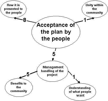Workshop participants were then asked to define what factors affected the achievement of each objective. To illustrate the method, we focus only on the question of developing a grazing management plan. It was recognized that the second objective (grazing systems management plan) had, in fact, two sub-components: the first was the development of the grazing systems management plan and the second was the acceptance of the plan by the community. Thus, the workshop group was given the task of developing spidergrams to address both of these issues (see Fig. 2 and Fig.3).
