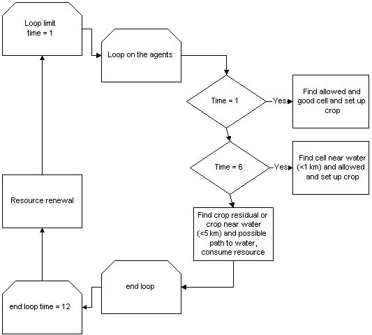Fig. 6. General algorithm of the role game and the model. At each time step (monthly), all agents look for a good place to make crops or to harvest pasture. The agents represent the actors, who may be farmers or herders. At ime step 1 (July, in reality), they look for a good place for the wet season crop, and time step 6, they look for a good place for the dry season crop. At the end of the year, there is a regeneration of the resource.