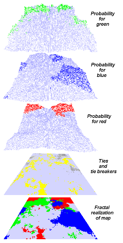 than gray cells (ties) because of three-way contentions. The red patch in the foreground of the final realization was not called for by the red probability layer, but was the result of arbitrage. The spatial statistics of all the categories are preserved within the final map.