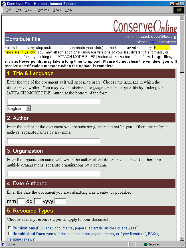 The catalyst to knowledge sharing on ConserveOnline is access to The Nature Conservancy's collection of distributed digital resources: elemental stewardship abstracts, grant proposals and reports, ecoregional and site conservation plans, and species management abstracts, among other things. Although making The Nature Conservancy's wealth of information available online is a resource-intensive process that requires a large number of skilled person-hours to solicit and categorize documents, the effort creates opportunities for social learning between contributors, other practitioners, and Content Coordinators. Contributors who are recognized experts in specific areas will be the first to have the opportunity to share their expertise through expert rankings and reviews. Similar to newsgroup moderators and directory guides, ConserveOnline experts add a human element to the Internet, and the strengths of these individuals will determine whether informal, social learning takes place. ConserveOnline uses the best available web applications and technologies, and will continually search for the most powerful tools and resources to attract and retain users. Some of the initial tools include: