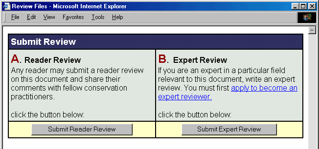 The broad community of conservation practitioners can rank and review the information available through ConserveOnline. Any user can post online reviews of documents in the library on the site, and recognized experts in a particular field can post expert reviews of documents. The search engine will sort documents according to expert reviews and users' rankings, with the more highly rated documents appearing higher on the search result list, thus helping the user to differentiate among a potentially large number of related items. Readers can also respond to comments on documents in the library and, in turn, authors can respond to those comments (http://www.conserveonline.org/2001/04/m/RJKOSE_2001-45). The result is a threaded discussion focused on particular issues. Thus, each document in the library can be interactive and can help build communities of conservation practice. Many conservation practitioners are beginning to see the importance of this type of a community, which can exist only on the Internet, for the future of all conservation efforts.