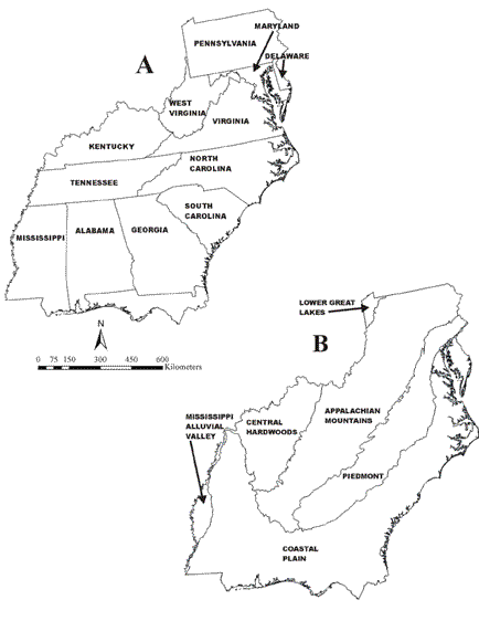 Breeding Bird Survey (BBS) results suggest a complex geographic pattern of population decline and recovery for forest passerine landbirds (Robbins et al. 1989, Askins et al. 1990, Finch 1991, Brawn and Robinson 1996, Villard and Maurer 1996). Over two-thirds of forest species in eastern North America migrate to wintering grounds in the Caribbean and Central and South America (Keast and Morton 1980), and many western species migrate through eastern North America (Moore et al. 1993). Intact migratory routes are critical for survival (Hutto 2000), and mortality during migration may be significant (Moore and Aborn 2000), yet we know almost nothing about which stopover habitat types are most important or how their distribution and quality define intact migratory pathways (Moore and Simons 1992). Spatial analysis of stopovers and pathways can provide a geographic framework for research in stopover ecology: the study of stopover habitat composition, distribution, and relative importance in life-histories of birds (Moore et al. 1995). Most stopover ecology research has focused on local habitat use (e.g., Hall 1981, Moore and Kerlinger 1987, Winker et al. 1992, Rappole 1995, Yong et al. 1998, Kelly et al. 1999), with practically no research on broad-scale habitat distribution. We examine this geography using simple models of migratory flights to evaluate the basic regional patterns found today and to encourage others to pursue similar broad-scale migratory research. Migration in birds may be controlled by inherited instincts for habitat preferences (Hutto 2000), migratory duration (Berthold 1996), and migratory orientation (Baker 1984). Although habitat type selection may be fairly inflexible, there is good evidence of flexibility in orientation (Woodrey 2000) and flight distance (Simons et al. 2000). Young birds may follow slightly different pathways than adults, allowing the species to sample many possible migratory routes (Berthold et al. 1992), with successful breeders endowing a predisposition for migration along intact routes (Berthold 1990). If a given pathway is sufficiently degraded, species may adapt through increased genetic representation by survivors following intact pathways (Berthold 1990). Changing patterns of usable pathways may contribute to the geographic pattern of population decline and recovery seen in the BBS (Brawn and Robinson 1996, Villard and Maurer 1996). As an initial step in research on interconnections between the pattern of migration pathways and breeding populations, we examine the geographic dynamics of migration using a model based on habitat, orientation, and flight distance between stopovers. Migration habitatsMigrant behavior within stopovers suggests birds employ local habitat selection, and the broad-scale distribution of migrants suggests an evaluation of regional patterns (Hutto 2000). Instinctual preferences for broad habitat types (forest, grassland, or wetland) may help migrants identify locations where their feeding and flight morphologies are best suited to exploit habitat structure (Petit 2000, Simons et al. 2000). The fact that forest migrants congregate in some stopovers but not others is well documented; whether this congregation represents habitat selection at multiple scales has yet to be examined in migration research. Research suggests that migrants select stopovers between midnight and 2 a.m. (Kerlinger and Moore 1989), possibly relying on habitat features detectable from the air in low light (Martin 1990). Migrants may track physiographic features, such as mountain ranges (Bruderer and Jenni 1990), coastlines(Able 1972), and rivers (Bingman et al. 1982), although such behavior is difficult to assess. We hypothesize that regional landcover patterns—such as amount and arrangement of forest, road density, or extent of agriculture—play a similar role in defining the broad habitat differences that forest migrants use to evaluate a region of potential stopovers (Moore and Aborn 2000, Hutto 2000, Petit 2000). Migratory orientationPredominant migrant navigation theories include: a solar compass for diurnal migrants (Schmidt-Koenig et al. 1991), a celestial compass for nocturnal migrants (Wiltschko and Wiltschko 1991), orientation along the Earth’s magnetic field (Wiltschko and Wiltschko 1988), olfactory navigation (Papi 1991), and navigation by infrasound emitted by large topographic features (Hagstrum 2000). The ability of migrants to navigate long distances along migratory routes is supported by many instances of site fidelity (e.g., Berthold 1993, Schmidt-Koenig et al. 1991, Winker et al. 1991, Nisbet 1969). This ability may be manifest as an inherited orientation preference (Berthold 1991), with random genetic changes causing some individuals to follow novel routes (Woodrey 2000). Springtime migrants follow a “northward preferred” migratory heading in the neotropic–nearctic migration (Berthold 1996). Most species exhibit clusters of orientation toward known breeding grounds (e.g., Moore 1984, Sandberg et. al. 1988, 1991, Sandberg and Moore 1996, Woodrey 2000), with older individuals exhibiting tighter clusters than young birds (Moore 1984, Woodrey and Moore 1997, Woodrey 2000, Berthold 1996). Clustering may represent previous success along optimal routes, as younger birds following novel orientations perish along sub-optimal routes, focusing the species toward orientations useful for migration. Nightly migratory flight distancesThe potential length of nightly flights between stopovers is a function of morphological characteristics such as body size, wing shape, and flight musculature (Pennycuick 1989), combined with energetic condition (Weber and Houston 1997a) and modified by external factors such as wind, turbulence, and weather (Richardson 1991). Literature reviewed by Kerlinger and Moore (1989) suggests migrants begin migratory flights shortly after sundown, the number of airborne birds peaks around 22:00, and flights are genera