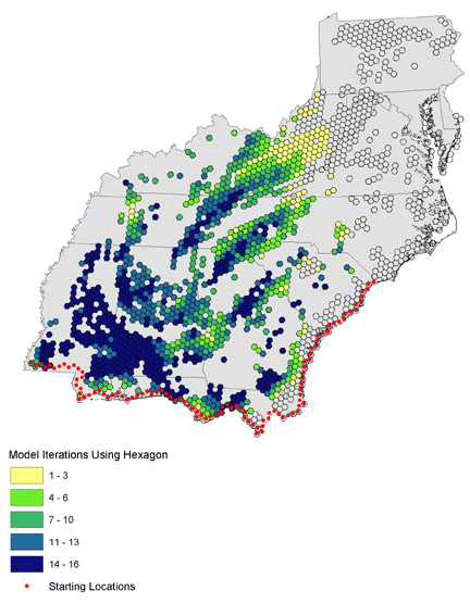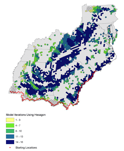 Overlapping models We ran 16 combinations of orientation and nightly flight distance for north-, northeast-, and northwest-bound migrants and present results as the number of models that use each hexagon (Figs. 10, 11, 12). Hexagons where many iterations overlap may represent stopovers that are important to a wide variety of birds in different energetic conditions and flying different routes. North- and northwest-trending birds cluster in the southwest and in identifiable bands through the central portion of the study area. Northeast-trending birds cluster along the northeast–southwest axis of the Appalachians, with a great deal of overlap at many locations across the landscape. We combined all 48 iterations of the collective models to identify locations where birds of all migratory orientations and energetic conditions tend to congregate (Fig. 13). There is a pattern of overlapping bands in the southwest, and it is likely that this trend would continue eastward if not for the lack of habitat at location 5 in Fig. 9. The Appalachians show a strong overlapping pattern, particularly in the south.