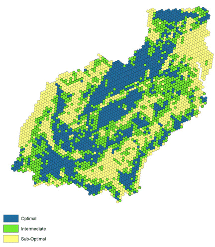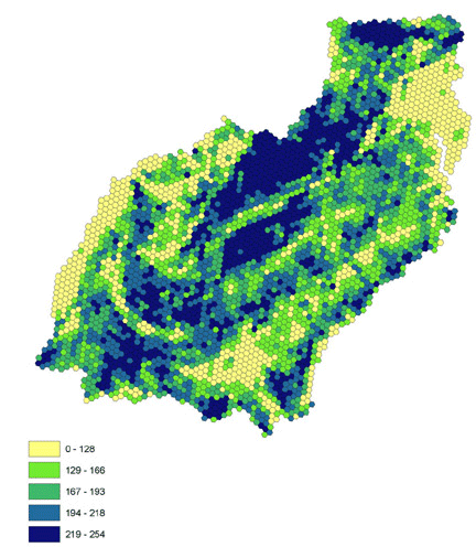 A ranking approach works well in broad-scale environmental analysis (Jones et al. 1997, O’Connell et al. 1998, Wickham et al. 1999). For each habitat variable, we developed an index such that an equal number of hexagons fell into each of three condition classes [optimal (3), intermediate (2), and sub-optimal (1)] and combined all rankings into a single measure. Thus a value of 3 represents sub-optimal stopovers, values 4–6 represent intermediate stopovers, and 7–9 represent optimal stopovers (Fig. 5). We selected hexagons in the “optimal” habitat ranking; all others were classified as non-habitat. At a sub-continental scale, these habitats may provide the core stopovers that ensure long-term successful migration for large populations of birds.