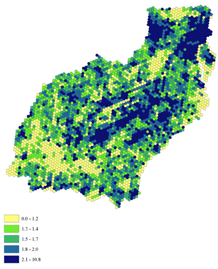 We selected habitat variables based on their correlations with forest migrant abundance and on possibility of aerial evaluation of the variable by migrants: local forest density (Fig. 2), measured using a 65-ha sliding window algorithm (see Appendix 1), percent agriculture (crops and pasture, Fig. 3), and road density (Fig. 4) measured as kilometers of road per square kilometer (ESRI 1997). We approximated a continuous landscape of circles by using hexagons. Local forest density and percent agriculture are related, but we found a strong negative relationship to percent agriculture that was not explained by a simple lack of forest (Tankersley 2002).