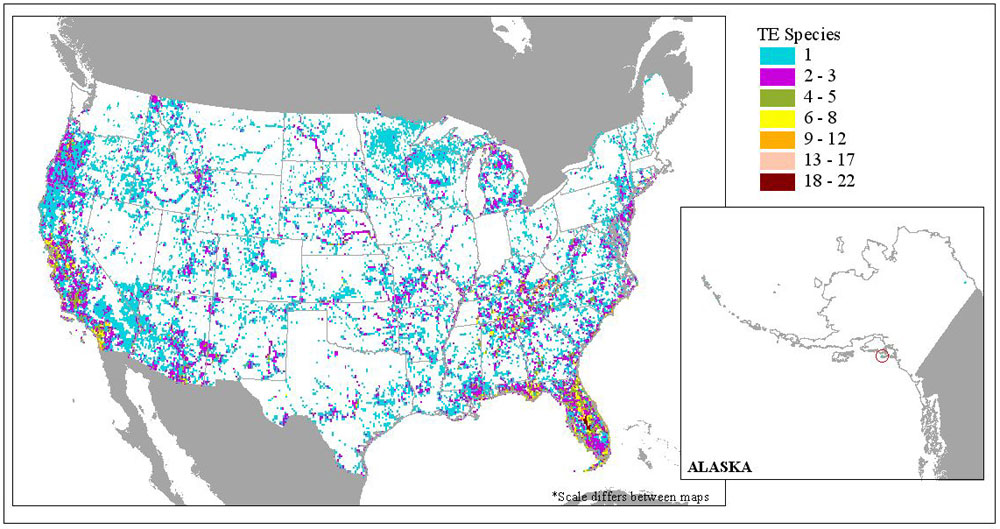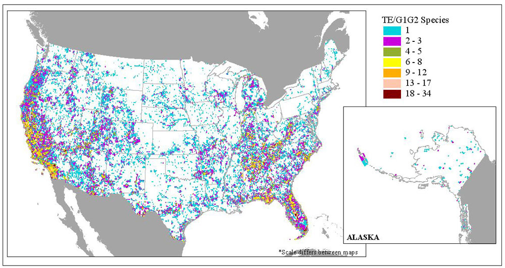 E. Dinerstein, N. Rana, T. Ricketts, R. Riordan, B. Stein, and three anonymous reviewers provided valuable comments on the development of this manuscript. NatureServe (www.natureserve.org) and its natural heritage member programs provided valuable locational data for TE and G1–G2 species. J. McNees of NatureServe provided valuable analyses of those data.