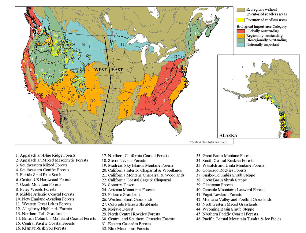 Ecoregions As seen in Fig. 1 and Table 1, we evaluated the potential benefit of IRAs for biodiversity conservation using the ecoregions and biological importance rankings provided in Ricketts et al. (1999). Using ArcView 3.2, we combined the IRAs and ecoregion coverages, both in vector format. To facilitate interpretation, we separated our analysis into three geographic regions, i.e., the eastern United States, the western United States, and Alaska, following the methodology used by DeVelice and Martin (2001).