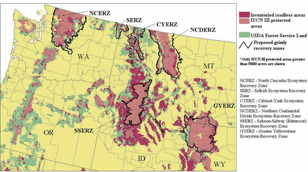 Grizzly bear case study As seen in Fig. 5, the inclusion of IRAs in the existing system of conservation reserves in Washington, Idaho, Montana, and Wyoming shows a strong concordance with the grizzly bear recovery zones of the U.S. Fish and Wildlife Service, as well as bear habitat range (Martin et al. 2000, USDA Forest Service 2000). In total, the six grizzly bear recovery zones include approximately 15,300 km2 of IRAs. Approximately 24,750 km2 of almost contiguous IRAs surround the Salmon-Selway (Bitterroot) Recovery Zone (SSRZ), which has already been designated a wilderness area and assigned to IUCN category I.