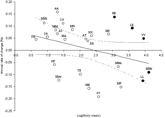 As we wanted to investigate size changes over time within the entire Danish mammal assembly, and to overcome the potential bias from site-specific measurements, we extracted our data from historical sources, i.e., scientific monographs. Using monographs alone also ensures homogenous and independent data for all species at a specific time. We obtained species mean body length measurements of Danish mammals from historical sources covering approximately 175 years (Holten 1800, Melchior 1834, Wulff 1881, Winge 1908, Hvass 1969, 1972). Within species and within the time period covered in this study, we presuppose body length to correspond closely to body mass, and size and size changes therefore refer to either term. Measurements were converted into metric units. All measurements from species where nomenclature uncertainty existed were excluded. Only measurements from Danish mammals and only unique data, i.e. not repeated from earlier sources, were included in the analyses. In cases where body length was given as an interval, we used the interval mean as the average body length. The latter procedure was tested on independent length data from our rodent database and found to be reliable as a measure of average length. The average body length of adults did not differ significantly from the length of the interval mean in five rodent species (interval mean vs. average length: R2 = 0.98, P = 0.002 for adults, 748 individuals). We calculated the trend in the body length change as the annual rate of change (i.e., the slope of the linear regression on the body length for each species as a function of time, divided by the most recent body length measurements (the 1969 or 1972 data), multiplied by 100%). We then applied three successive general linear models. The first model described the rate of body length change as a result of present body mass (Appendix 1). The second model also included the impact of traffic as an independent variable (Appendix 1). Danish estimates of proportion of population killed in traffic only exist for badger (Meles meles; Aaris-Sørensen 1995); therefore, we supplemented this information with assessments from two neighboring countries, Sweden (Göransson et al. 1978) and Germany (Hauer et al. 2002), which most likely reflects the situation in Denmark. Hence, hedgehog (Erinaceus europaeus), brown hare (Lepus europaeus), red fox (Vulpes vulpes), otter (Lutra lutra), and badger were set to have high traffic mortality. Remaining species were set to have low traffic mortality. The average number of clutches per year (Appendix 1), was added as an independent variable in the last model.