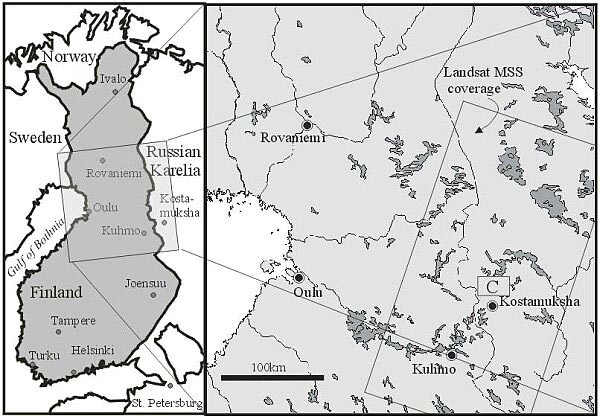 Many scientists have called for research in the Russian taiga, where extensive and relatively unmodified forest areas still exist (Syrjänen et al. 1994, Uuttera et al. 1996, Lindén et al. 2000, Yaroshenko et al. 2001). The study area is one of several large forest remnants in Fennoscandia along the Finnish border in Russian Karelia. These areas are geopolitical artifacts: a military buffer mandated by Soviet policy. Given that there are clear-cut areas and young plantations just across the border in Finland, this situation can be seen as a unique ecological experiment awaiting examination; see Kalliola et al. (2002) for a more detailed description of the study area. The study area covers forest areas north and west of the city of Kostamuksha (population 31,000) and extends westward to the Finnish/Russian border up to approximately 60 km northeast of the city of Kuhmo, Finland, and 17 km east of the border (Fig. 1). The study area, hereafter referred to as Vienansalo, encompasses approximately 280,000 ha of forest and mire and is centered on a point located 64° 41' N and 30° 4' E. The Vienansalo area lies north of the Kostamuksha Strict Nature Reserve and extends westward to the Finnish/Russian border.