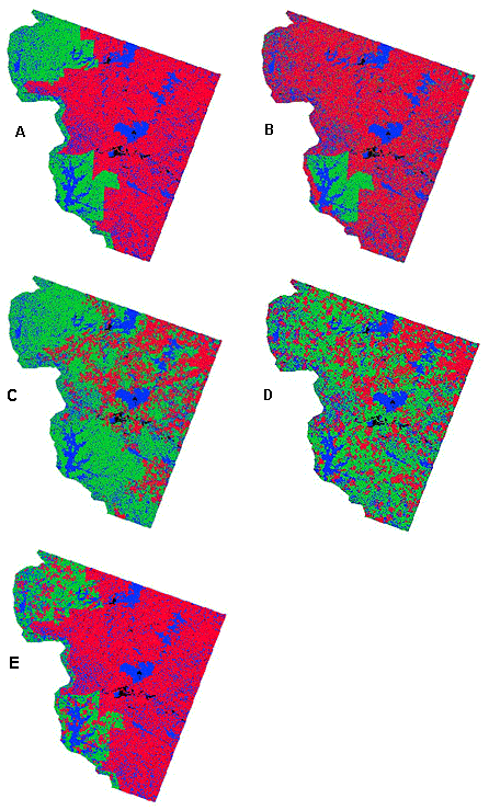The stepwise cross-validation conducted on these k-nn estimates is shown in Table 1. This "leave-one-out" testing shows good results for the estimation. For instance, for a k value of 5, the root mean square error (RMSE) is lower than is normally considered acceptable for the Finnish National Forest Inventory calculations. Forest landscape changes according to different scenariosUnder the Status Quo scenario, old forests (> 150 yr old) will disappear completely from the regular management zone within a period of less than 80 yr, and the assumed protected areas will remain as separated blocks of old forest in the KR, PP, and SZ (Fig. 12A). The Status Quo simulation suggests that new forest clearcuts will advance across the entire RMZ in a roughly southwest direction, finally leaving the conservation areas as large, sharp-edged patches embedded in a matrix of young forest.