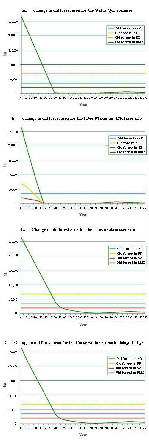 The percent of old forest overall and in the RMZ under the various management scenarios at 10, 50, and 100 yr are summarized in Table 2. The Status Quo and Conservation scenarios differ only in their harvest rate, not the area available for harvest, which is restricted to the RMZ. Thus, the difference in overall old-forest coverage is minor. However, the rate of loss of old forest in the RMZ differs significantly between these scenarios. The Fiber Maximum scenario increases the rate of harvest compared to the Status Quo and opens the SZ and PP areas to logging. This is reflected in the table, which shows both a more rapid decrease in the amount of old forest and a lower final overall percentage of old forest. Apart from remnant seed-tree patches, current harvesting rates will remove all the old forest outside of protected areas in less than 100 yr.