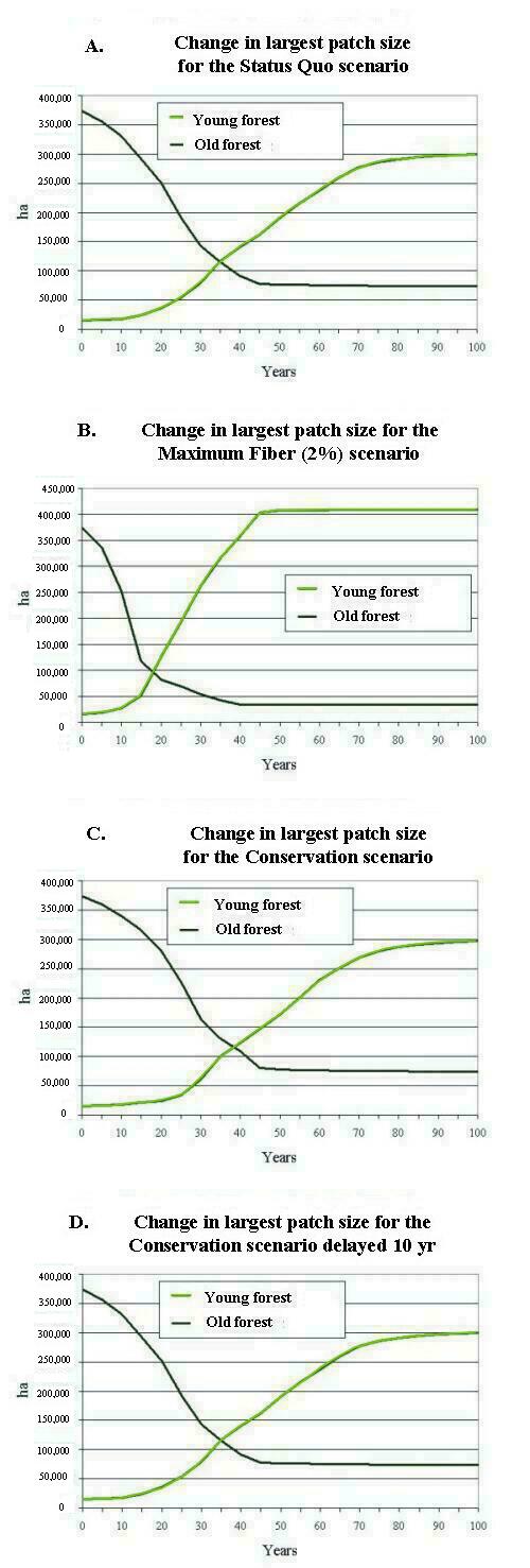 Because of the simple binary classification system ("old" or "young" forest), if the simulation places a new clear-cut next to an area of forest younger than 150 yr, the number of young forest patches (Fig. 14) will not increase, whereas the number of old forest patches may either increase if the harvesting divides an old patch into two or decrease if the young patch eliminates one or more of the old patches. This is why the number of patches increases only modestly for young forest, but first increases and then drops quickly for the areas of old forest. Comparing the scenarios, although the main difference between Status Quo and Fiber Maximum is the speed of changes, their overall consequences as far as contiguous patches are concerned are rather similar. Both scenarios suggest a dramatic increase in the number of old forest fragments, each of which decreases in size. The largest contiguous patch will be a clearcut/regeneration stand complex after 35 yr in the Status Quo scenario and in less than 20 yr in Fiber Maximum scenario (Fig. 15). The increase in mean patch size of old forest in the Fiber Maximum scenario after 45 yr is because of the final loss of tiny forest fragments, leaving only the large old-forest patches in the Kostamuksha reserve.