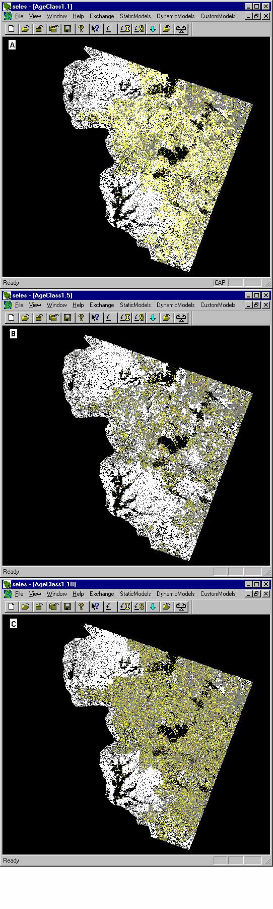 Figure 12B shows the pattern dynamics that will occur in the accelerated Fiber Maximum scenario: conversion to almost total young forest patches happens at the halfway mark of the simulation, after approximately 50 yr. Note that harvesting also occurs in the PP zone. In Fig. 12C we observe that the reduced rate of cut and the exclusion of the two reserve areas has the effect of preserving large contiguous areas of old forest, while leaving a network of such areas within the RMZ. Unfortunately, as we can see from later graphs that show the simulations extended an extra 150 yr beyond the 100 yr terminus of the animations, these networks are not sustainable at even this lowered rate of cut. The Fire Only scenario (Fig. 12D) draws attention to the very clear differences between human-induced systematic and fire-induced "natural" disturbances. The former lead to effective fragmentation of old forest patches within the RMZ, and the latter to an archipelago of young forest patches. The most "realistic" of our coarse scenarios, Status Quo plus Fire, is presented in the 100-yr Fig. 12E animation. The time horizon when all the old forest in the RMZ will have been exhausted is year 2044 for the Fiber Maximum scenario, 2066 for the Status Quo scenario, but not until 2140 for the Conservation scenario (Fig. 13). In the Conservation scenario, the trend in old forest removal mirrors that of the Status Quo until 2066, and then drops markedly. This is a result of the lower rate of harvest, which allows second-growth forest to age beyond the minimum harvest age of 80 yr; some of this second-growth forest is likely to be more accessible than the remaining fragments of old forest. In all scenarios, gradual increases in the amount of old forest area in the RMZ after 140 yr occur because of the maturation of the reforested Soviet-era clear-cut areas. However, this increase in old forest is not sustained because the harvest rotation is shorter than 150 yr.