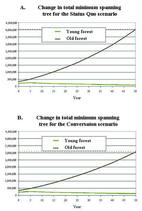 Figures 16A, 16B, and 16C present the results of the minimum spanning tree analysis and show trends in connectivity. Isolation of fragments occurs through the fragmentation of old forest, resulting in an almost exponential increase in the mean spanning tree distance (Fig. 17). Because harvesting is conducted only in the regular management zone, the computed scenarios of Status Quo and Conservation show almost identical consequences. However, the lower harvesting rates in Conservation result in a less dramatic increase in patch isolation.