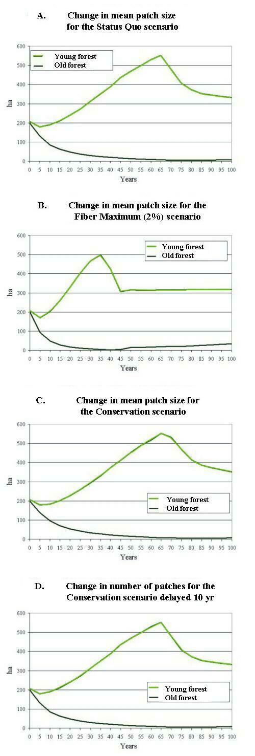 Simulation results at the landscape level Although the long-term consequences of the management scenarios for old forest could be derived analytically, the use of a simulation model is helpful when assessing temporal trends and spatial patterns of development. Examples of landscape-level grid-based modeling such as the one described here have been conducted on Amazonian colonization frontiers (Soares-Fihlo et al. 2002) and land use/land cover changes in the midwestern United States (Brown et al. 2000). All such experiments necessarily trade model resolution for model extent. By resolution we refer not only to the spatial and temporal scales at which the scenarios are implemented, but also to the number and sophistication of the submodels they incorporate. Future work in the Vienansalo framework could implement stand-level modeling such as the type used by Pennanen (2002). However, the more site-specific and detailed the modeling exercise is, the more accurate the input data need to be, a condition that cannot always be met in landscape-level research in remote areas. Several trends in patch analysis are of interest for conservation planning ecology. Our results show that, within approximately 30 yr, the landscape studied will have more young forest than old forest areas, indicating a shift in the underlying landscape matrix. Mean patch size (Fig. 19) for young forest will not change monotonically during the process of fragmentation. Because there are large areas of Soviet-era clearcuts in the eastern section of the survey area, the dissection factor causes new, smaller clearcuts placed in the old forest matrix to temporarily depress the mean patch size in the young forest, which explains the early dip in mean patch size (Fig. 19). From these initial relatively small and isolated young forest patches, we expect mean patch size first to increase as the blocks begin to coalesce and then start to decrease at the threshold at which the last small, isolated old forest fragments in the regularly managed zone, e.g., tree islands surrounded by mire, start to disappear. This threshold marks a key phase transition in the shift from a landscape structure dominated by old forest to one dominated by young forest. In our Status Quo scenario, this transition occurs at about year 65. In the Conservation scenario, the transition occurs at about the same time, but the shift is less abrupt. The Fiber Maximum scenario results in a drastic reduction of this phase transition to year 35. Furthermore, the statistics related to contiguous patches in the Conservation scenario do not differ markedly from the Status Quo scenario, which is mainly an indication of the blocklike nature of the conservation of large landscape entities.