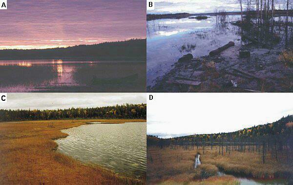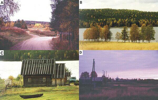 The human impact in the Vienansalo region can be generalized to three types of activities: forest use, agriculture, and mining. The town of Kostamuksha was established in the 1970s to support the exploitation of the region's large deposits of iron ore. During subsequent decades, large areas have been transformed into a landscape of open mire, hills of waste stones, and dammed lakes (Fig. 2B). Small-scale agriculture and forestry have traditionally been practiced along rivers and beside the lakes in the region (Fig. 4). Industrial uses in the 20th century included tar extraction from pines and, since the 1980s, clear-cut harvesting (Fig. 5).