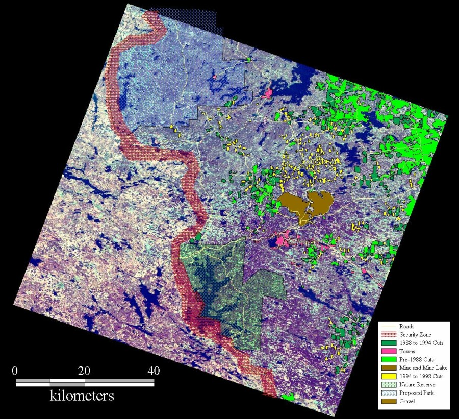 Our multitemporal GIS database (Fig. 7) records a major change in forest harvesting practices between the years 1988 and 1998. Prior to 1988, large clearcuts had advanced westward in the eastern part of the study area, resulting in a belt of clear-cut landscape that left the western part and the border zone near Finland relatively intact. During 1988–1994, although most of the new clearcuts were made north of the mine/mine lake complex or next to the pre-1988 clearcuts, some new clearcuts had begun north of the city. The 1994–1998 era also revealed a new type of forest cutting policy that resulted in a unique landscape of quadrangular chessboard clearcuts (Fig. 10) embedded in a near-natural forest matrix.