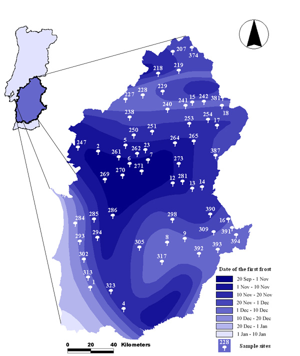 The study area encompasses the Alentejo region in southern Portugal (Fig. 1). This area was chosen because it encompasses over 1 million hectares of montados, a large enough area to enable the investigation of contrasting ecological forces. Data were collected during 1998 and 1999 at 60 sampling sites distributed all across the study area (Fig. 1). Sites were selected using the European Community Forestry Monitoring 16 x 16 km grid, with the resolution increased to 8 x 8 km with the help of a geographic information system (GIS). Within this systematic grid, and with the help of an agro-forestry map, we chose 100 intersections at random as potential sites, verified them all in the field, and selected 30 that were cork oak-dominated montados and 30 others that were holm oak-dominated montados. This stratification ensured equal representation of both oak species. Montados thrive under the typical Mediterranean climate of long, hot, dry summers (daily maximum temperature often reaches 40ºC) and mild, humid winters (average rainfall of 500–650 mm) (Instituto Nacional de Meteorologia e Geofísica 1991), varying from the milder conditions along the ocean shore in the west, to the more extreme continental east (Rey Benayas and Scheiner 2002).
