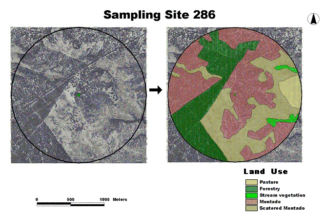 Data collection One way to analyze the impact of human activities on an ecosystem is to identify and quantify the agro-economic activities (cork harvesting, herding, and cereal cultivation, for example) that characterize each site. Another way is to look for patchiness resulting from different land uses and, therefore, we also used landscape metrics as explanatory variables. Thus, we had two separate sets of human-induced variables which, together with a set of environmental variables, were used as explanatory variables to identify the driving forces underlying montado species composition and diversity. A systematic field survey of plant and bird species was performed in 1998 and 1999 at 60 sampling sites distributed across the study area (Fig. 1). Four sets of variables were collected: the Bio, Eco, Land, and Ae sets.