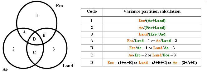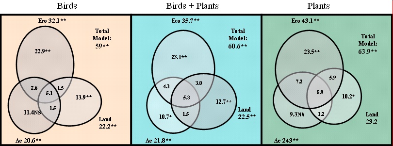 The Bio set comprises 14 000 identified plants (596 species) and 17 000 sightings of birds (128 species). The explanatory variables collected amounted to 79 (Table 1); this number was reduced to 24 (Table 3) and subsequent analyses used these 24 explanatory variables only. Other authors have successfully reduced a larger set of variables to seven, in order to standardize groups of factors in partial RDA (Paszkowski and Tonn 2000). To the best of our knowledge, the present study provides the first clear compositional and ecological concordance of plants and birds in an ecosystem; Woinarsky et al. (2001) found a relationship between bird species composition and plant grouping, but each distribution was explained by a different ecological driver. Species richness and compositionThe species richness of plants and birds was not correlated: sites with high plant diversity did not have high bird diversity, and vice versa. The results of the Spearman correlation test (R = 0.063; p = 0.96) do indicate a random relation between the two groups. However, the Mantel test result was highly significant (Rho = 0.202; p = 0.0005), uncovering a clear turnover similarity in plant and bird species distribution: Bray–Curtis distances between the 60 sites showed practically the same biogeographic pattern for the two groups. Analysis of total variance: exploring who’s who in shaping the montado ecosystemVariance partitioning suggests that humans (Ae and Land, the two sets of anthropogenic variables together covarying out Eco) account for as much of the variance in global biodiversity (plants + birds) as nature (the Eco set covarying out Ae and Land) (Fig. 4) (For calculations, see Fig. 3: humans=2+3+C and nature=1; thus, in Fig. 4, humans=10.7+12.7 +1.5=24.9% and nature=23.1%.) The full model explained 60.6% of the variance: both the model and the first axis were significant (please refer to Fig. 4 and Table 2). Each of the three sets of explanatory variables was significant on its own. The Eco variables explained 35.7% of the total variance, the Ae variables 21.8%, and the Land variables 22.5%. In the Eco set, this percentage fell to 23.1% when covarying out the Ae and the Land variables (this figure is still highly significant, and it corresponds to eight variables being covaried out by 16). In the Land set, the percentage fell to 12.7% when the Eco and Ae variables were covaried out but, again, was still very significant (p < 0.0001). In the Ae set covaried out by the Eco and Land variables, variance fell to 10.7% and this value was almost nonsignificant (p = 0.0403). In fact, most relationships were actually found to be highly significant: after 9999 Monte Carlo permutations, all relations were found to be significant: eight with p < 0.0001, one with p < 0.01 (in the Land set), and three with p < 0.05 (in the Ae set) (Table 2). The model improved when run with data on plants only (63.9% of the variance explained; Fig. 4). In this case, the environmental (Eco: 23.5%) surpassed the anthropogenic variables (Land+Ae=20.7%) in explaining species distribution. The Ae set of variables, significant on its own, was nonsignificant when covaried out by the Eco and the Eco+Land variables; most of the variance apparently explained by management differences was in fact induced by ecological and structural (landscape) constraints. When restricted to bird data, the model explained 59% of the variance (Fig. 4). With birds, anthropogenic variables exceeded environmental ones (25.3 and 22.9%, respectively) in explaining species distribution. However, the set of agro-economic variables, significant on its own, was nonsignificant when the other two sets of variables were covaried out (Fig. 4). As with plants, the physical structure of the ecosystem and ecological variables seemed to be the main driver of bird distribution.