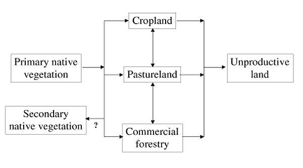 Fig. 6. A conceptual model of land-use change patterns in the Western Australia (WA) agricultural region. The return of land to secondary native vegetation in WA is under investigation.