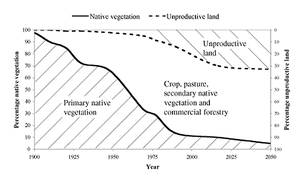 The condition of remaining native vegetation will continue to decline due to other effects including salinity, grazing and pest invasions and many more trees will eventually be lost from the landscape (Saunders et al. 2003). The line for the percentage of land use that is unproductive is based on values for agricultural land at risk from salinity in 2000 and the predictions of the extent of salinity (33%) in 2050 and 2300 are based on groundwater trends and “best guess” future land use (Hatton 2003, Hodgson et al. 2003). Hydrological equilibrium is predicted to be achieved between 2030 to 2050 in some areas on the western edge of the agricultural region but may take as long as 300 years in the eastern parts of the region (Hodgson et al., unpublished). The prediction of the amount of land that will become unproductive (33%) is based solely on the effects of salinity and does not include any other forms of land-degrading processes that may partially reduce soil fertility, such as acidification, sodicity, and erosion (National Land and Water Resources Audit 2002). To place this rate of change in the global context, one estimate of the total conversion of primary native vegetation to cropland worldwide was 10.7 million km2, of which 20% was subsequently abandoned (Lambin et al. 2001).