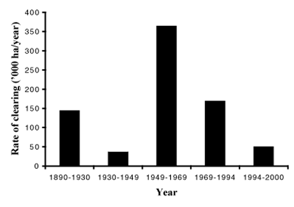 vegetation to productive broadacre agricultural system. Although persistent as an intensive agricultural system for more than 100 years, the land use has been dynamic. From a landscape dominated by native vegetation in the late 19th century, it became virtually treeless by the 1990s. The history of the dynamics of land-use change is illustrated by classifying and identifying the temporal patterns of land-use change between 1900 and 2000 and predicted changes to 2050 (Fig. 7). The greatest rates of clearing (Fig. 8) occurred in three phases, the first from 1900 to 1930 (144 000 hectares per year), the second from 1949 to 1969 (364 000 hectares per year) and the third from 1969 to 1994 (164 000 hectares per year) (Burvill 1979, Beeston et al. 1994). In the WA agricultural region, significant areas of non-productive land, due to inundation and soil salinity, appeared within 100 years of the first major phase of land clearing for agriculture. Sixteen percent of the area had developed soil salinity by 2000 and is now largely unproductive (National Land and Water Resources Audit 2001). One very important point is the time delay between the direct cause, land clearing, and the effects, inundation and the appearance of soil salinity, a slowly emerging ecological variable. Temporal separation between cause and effect often contributes to the intractable nature of problems (Meadows 1982). Recently, some land-use change from cropland to commercial forestry has occurred, in part to combat the hydrological imbalance. However, this represents a very small proportion of the total land area and occurs mostly in areas with rainfall greater than 600 mm; it will have no positive effects for large areas that are or will become salt affected. In 2000, the Environmental Protection Authority (EPA) took a strong position with a presumption against land clearing in the southwest of Western Australia for agricultural purposes and, in recent years, most applications referred to the EPA by the Commissioner of Soil Conservation have been denied.