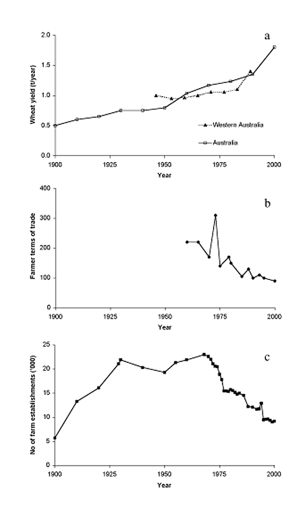 Since the 1960s, farmers have faced constantly increasing costs and declining terms of trade, countered by increased productivity and efficiencies in recent times. Increases in crop production since 1960 have come from increases in yield (National Land and Water Resources Audit 2002). The trends for wheat yield for Australia and Western Australia between 1900 and 2000 (Hamblin and Kyneur 1993, Passioura 2002) are shown in Fig. 9a. The productivity gains for Australia occurred in three phases, 1900, 1950, and 1990, the greatest gains being achieved since 1990 (Passioura 2002). The significance of the increasing wheat yield is that it must be viewed against the economic background. If farmers are to continue to grow wheat, productivity must increase at a sufficient rate to counter the combined effects of declining terms of trade, the short-term fluctuations of climate, and world commodity prices. It was reported that Australia had the lowest rate of increase in wheat yield between 1950 and 1990 compared with its competitors in the world market (Hamblin and Kyneur 1993). The profitability of Australian agriculture, with its orientation towards export trade, remains closely linked to price fluctuations in international markets (Australian Greenhouse Office 2000). The trend of increasing wheat yield whilst achieving productivity targets under conditions of command and control policy masked other social and ecosystem variables that indicated a system in a state of change.