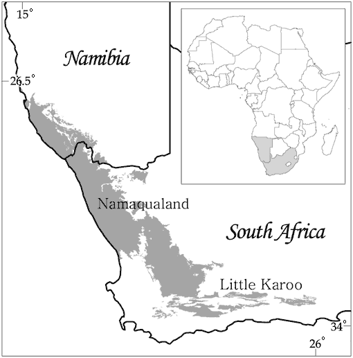 The Succulent Karoo biome covers an area of approximately 116 000 km2 located in the southwestern corner of southern Africa (Fig. 1). It forms the arid ecotone (rainfall <350 mm/yr) between the winter-rainfall Fynbos biome and the summer-rainfall biomes of the region (Cowling et al. 1999a, Dean and Milton 1999). Floristically, it forms part of the Cape Floral Kingdom (J. Born, H. P. Linder, and P. Desmet, unpublished data). The hallmark of the Succulent Karoo is its exceptionally diverse and endemic-rich flora, especially succulents and bulbs. The biome is home to 6356 plant species, 40% of which are endemic and 936 (17%) of which are Red Data Listed (Driver et al. 2003). In addition to its floral diversity, the biome is a center of diversity for reptiles and many groups of invertebrates. The Succulent Karoo biome is one of 25 internationally recognized biodiversity hotspots and is the world’s only arid hotspot (Mittermeier et al. 1998). However, only 3.5% is formally conserved, and the biome’s biodiversity is under pressure from a range of human impacts, especially mining, crop agriculture, ostrich farming, overgrazing, illegal collection of fauna and flora, and anthropogenic climate change (Driver et al. 2003). Hence the urgency to address the question of conservation targets.