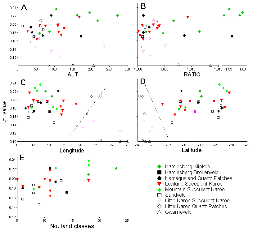 The z-value was calculated for each vegetation type using Eq. 4. The average relevé size was taken to be 10 x 10 m or 100 m2. Varying the relevé area by an order of magnitude (i.e., 10 to 1000 m2) changed the resultant z-value by less than 0.01%. Extrapolating z-values to vegetation types with insufficient dataIn order to extrapolate the observed patterns in z-values to all vegetation types in the Succulent Karoo, the z-values were related to the five landscape environmental variables (Fig. 2). In Fig. 2, the z-values are classified into the higher order vegetation categories presented in Table 1. There appear to be relationships between observed z-values per vegetation type category and the landscape variables examined. Regression models were built for the Namaqualand Succulent Karoo (Fig. 3); Namaqualand quartz patches (Fig. 4 and Fig. 5); and Sandveld (Fig. 6) vegetation categories (see Appendix 1). These were the only models that were significant, given the number of data points (i.e., vegetation types with calculated z-values) available fore each model. For all three cases, the basic model used to extrapolate values expresses the z-value, firstly, as a function of geographic location and, secondly, as a function of topographic diversity.