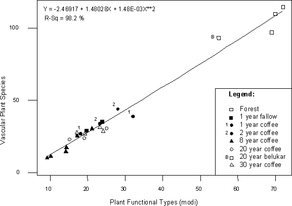 identification through a herbarium. Such facilities are rarely available in many tropical developing countries and their absence can influence data quality as a result. Where formal species identification is not feasible, the use of PFTs facilitates rapid and uniform data collection that is largely independent of the need for identification of a scientific name, provided morphospecies are recognizable. Recent studies (Gillison 2002) suggest composition rather than richness of PFTs or species determines ecosystem behavior and this is consistent with other views (cf. Folke et al. 1996). Only PFT and species richness were analyzed in this study and found useful for predicting site and soil condition. By association, these are testable predictors of coffee production and profitability. Both PFTs and plant functional compexity (PFC) emerge as the most potentially useful indicators overall of both biodiversity (expressed in terms of both species and PFTs) and soil nutrient status.