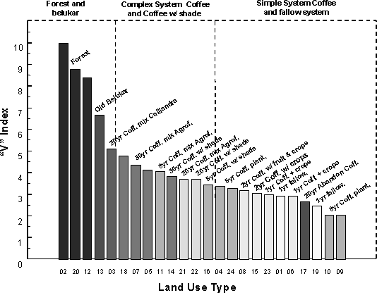 management where quantification is vital and where any species, either exotic or indigenous, is an integral part of the bio-ecological landscape. In this paper, we examine the potential value of certain suites of indicators of change in biodiversity under different forms of land use in coffee-based agroecosystems involving both exotic and indigenous plant species. In so doing, we focus on causal rather than correlative links within the context of management scale