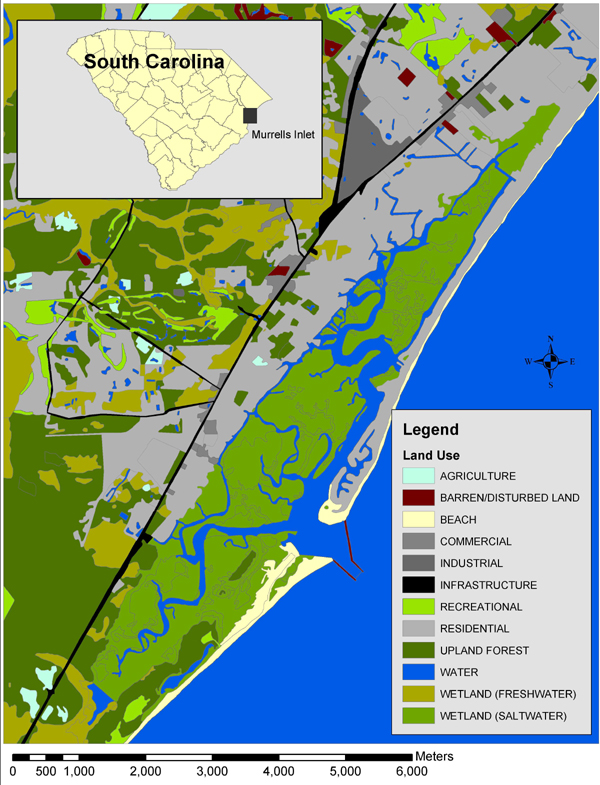 Murrells Inlet estuary (MIE) is a high-salinity, 26.7 km2 estuary containing urbanized uplands, marshland, and water. It is located approximately 122 km northeast of Charleston, South Carolina, USA (Fig. 1). Murrells Inlet is characterized by semidiurnal tides with a mean range of 1.37 m. The area has been experiencing high rates of residential and commercial development to satisfy the demands of a growing coastal population (Porter et al. 1997).