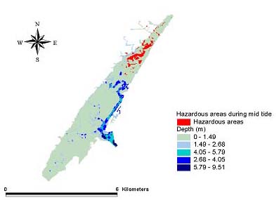 Distribution patterns of UV intensity on the bottom were found to be similar for all three months. Deeper areas near the mouth of the inlet were characterized by little or no UV penetration. Shallower parts of the northern and southern inland areas saw the highest UV penetration at the bottom. The inland areas of the extreme northern and southern portions of the estuary received enough UV at the bottom to reach the laboratory minimum for causing toxicity to A. tenuiremis. This suggests that the northern, urbanized portion of the estuary creek bed, with its high total PAH levels, could be susceptible to photoenhanced toxicity. For some parts of the inland estuarine areas, depths were 0 m at low tide, and UV on the creek bed was equal the initial UV intensity. UV intensity on the bottom appeared consistent across the months of May, August, and October despite seasonal trends in UV extinction levels. This may be because trends in UV levels at the surface may counteract seasonal trends in extinction. Hazard modelsGeographic areas that could be considered hazardous because of phototoxicity to A. tenuiremis within the Murrells Inlet estuary were mapped for low and mid tide during the months of October 1998, May 1999, and August 1999 (Figs. 8–13). For all three months, these hazardous areas were located during low tide in the urbanized extreme northern portion of the estuary, mainly on the inland side. In May 1999, 929,416 m2 or approximately 16% of the suitable A. tenuiremis habitat was susceptible to phototoxic effects during low tide. In the creek bed, susceptible areas were either exposed during low tide or less than 0.5 m deep. For August 1999, also during low tide, 16% (935,072 m2) of suitable habitat was susceptible. In October 1998, 16% of suitable habitat was susceptible (929,416 m2) at low tide. At mid tide, the areas susceptible to phototoxic effect were reduced by half for all three months. Approximately 503,355 m2 or 8.5% of suitable habitat was susceptible in May 1999, 8.7% or 509,011 m2 in August 1999, and 8.4% (495,814 m2 ) in October 1998. These areas were also in the northern urbanized portion of the estuary. No areas were susceptible as a phototoxicity hazard to A. tenuiremis during high tide.
