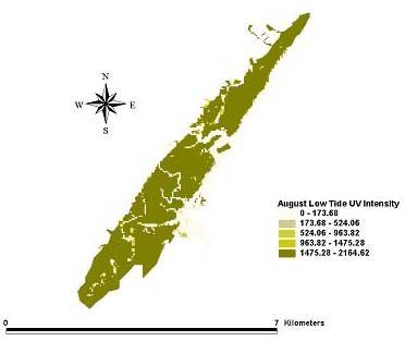 where Ke = UV extinction coefficient, U.S. National Wetlands Inventory (NWI) data for Murrells Inlet were used to identify areas that were classified as appropriate intertidal and subtidal habitat for A. tenuiremis. These areas extended from the tidal creek fringe dominated by Spartina alterniflora (smooth cordgrass) to the low intertidal mudflat. To generate the final hazard model, cells in the PAH hazard grid, the UV hazard grid, and the habitat grids were assigned values and multiplied across grids. UV hazard grid cells for each month were assigned a value of 2 if their UV levels were equal to or greater than the minimum level toxic to A. tenuiremis at 1 cm depth in the laboratory. All other cells were assigned a value of 1. Similarly, PAH hazard grid cells with PAH levels equal to or greater than the minimum laboratory level to contribute to photoenhanced toxicity for A. tenuiremis were assigned a value of 2. Each UV hazard grid was multiplied by the PAH hazard grid, resulting in a composite grid of hazard for the estuary. Hazard grids were then multiplied by the suitable habitat grid. The habitat grid cells were coded 2 if the NWI classification corresponded to one of the following habitat types: Estuarine Subtidal Unconsolidated Bottom, Estuarine Intertidal Unconsolidated Shore, Regularly Flooded, Estuarine Subtidal Unconsolidated Bottom, or Estuarine Intertidal Unconsolidated Shore, Irregularly Flooded. The resulting grid represents areas that meet all three criteria noted above as potentially hazardous to A. tenuiremis in Murrells Inlet.